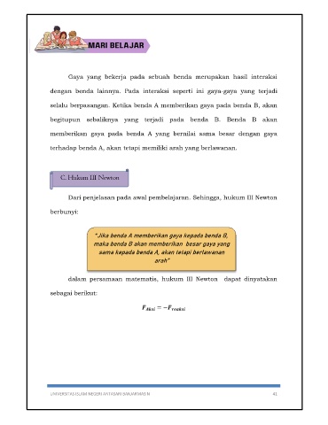 selalu berpasangan. Ketika benda A memberikan gaya pada benda B, akan
