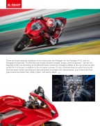 There are three separate variations of the motorcycle; the Panigale V4, the Panigale V4 S, and the Panigale V4 Speciale. The first two are closely related in weight, torque, and horsepower -- but the V4 Speciale is the true derivation of the MotoGP spirit, boasting a whopping 226hp at the rear wheel as well as 98.5 lb-ft of torque. In addition to the increase in power, it’s also slimmed down an extra five pounds from the basic model, providing an improved power-to-weight ratio. Nonetheless, any of the three Pani- gale models are plenty fast, plenty stylish, and plenty Italian. >>