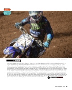 began to strut away, and it was time for business. Harrison’s small stature really allowed his Yamaha to dig into mother earth, and with the throttle twisted to the max, he came away second amongst the pack up horsepower hill. Battling with the likes of Savatgy, and teammate Jeremy Martin, he showed little to no weaknesses in the opening moments; however, the remarkable speed began to fade as the laps progressed, almost as if the heart rate sent a spike of adrenaline through his veins, and would have to subside at some point. Being constantly pestered, he couldn’t seem to catch his breath, as each lap brought another assassin at his bay. Slash- ing with all of his might, he would try his best to anchor and stay put in his respective position. Unfortunately the pressure would never subside, and he would drop to 14th by moto’s end. Mitchell shook the crystal ball to see the future, but unfortunately wished he could turn back time, as the number 289 sat just inside the top twenty for the opening festivities of moto two. After battling amongst some of the best in the world, Harrison once again was receiving his freshman initiation; never counting the chickens before they’ve hatched, and before he knew it, he was sitting outside of the top thirty and disgusted with agony. The end result would be a 20th overall, but with the glimmer of speed he showed, it may be just what he needs in order to build into the future.