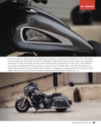 There are just as many functional adaptations as there are aesthetic modifications in the new model, focusing solely on enhanced comfort and rideability. There are three new ride modes: tour, standard, and sport, in order to provide the rider with a suitable riding experience to their style. The Chieftain also comes standard with keyless ignition, cruise control, and ABS. Rear Cylinder Deactivation au- tomatically shuts off the rear cylinder when the bike is stopped for enhanced comfort in slow-moving traffic, and as soon as you hit the throttle it seamlessly reactivates for full power. >>