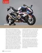 BMW’s ShiftCam technology that was introduced on the 2019 BMW R1250GS that employs a camshaft with two different lobes manipulating each of the eight intake valves has been applied to the S1000RR, utilizing partial-load lobes below 9,000 rpm to boost engine torque while simultane- ously reducing excess mechanical noise and increasing engine efficiency. Thanks to an improved camshaft and “hollow-bored” titanium valves with a twenty-five-percent lighter DLC-coated rocker arm, the engine spins 400rmp higher than before all the way to 14,600 revs. Complemented by the returning variable-length intake funnels that shift from a long to short position at 11,700 rpm, therefore improving the mid-to-top engine performance noticeably. The com- pression ratio has also increased slightly in the bore and stroke by a slight .3 percent. BMW claims that the inline-four delivers