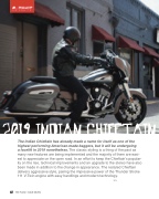 a facelift in 2019 nonetheless. The classic styling is a thing of the past as many new features are being implemented and the majority of them are easi- est to appreciate on the open road. In an effort to keep the Chieftain’s popular- ity on the rise, technical improvements and an upgrade to the stereo have also been made in addition to the change in appearance. The restyled Chieftain delivers aggressive style, pairing the impressive power of the Thunder Stroke 111 V-Twin engine with easy handlings and modern technology.