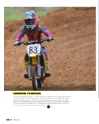 Corinthia Crawford AKA ‘Cheeto’ is the next big name in Women’s moto. Hailing from Firestone, Colorado, Cheeto competes in the Girl’s 711 and 65 79 classes. A top 3 finisher in the Girl’s class, Corinthia also has a lot of top 15 and a few top 5 finishes in the young 65 class. She picked up a championship at last year’s Women’s Cup and a 2nd overall this year at Oak Hill. This 9 year old won the the Girl’s 51cc 79 Championship at Freestone last year, so look for more Crawford on the top step of the podium in 2016.