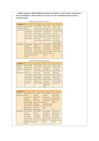 Rubrik penilaian dapat dilakukan dengan mengikuti contoh format, namun guru bisa memodifikasi contoh rubrik di bawah ini sesuai kebutuhan dan kreatifitas masing-masing.