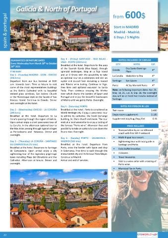 sightseeing tour of this legendary pilgrimage monumental city and its famous Plaza Mayor. • 3 dinners.