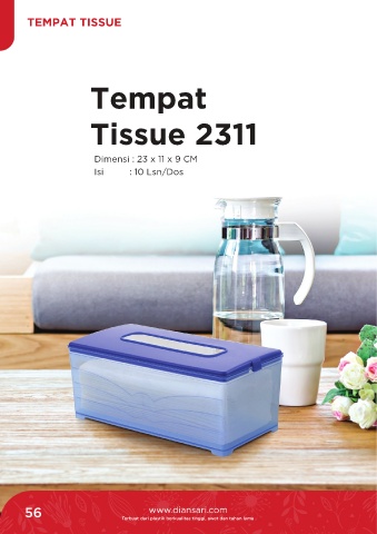 TEMPAT TISSUE Tempat Tissue 2311 Dimensi : 23 x 11 x 9 CM Isi : 10 Lsn/Dos 56 Terbuat dari plastik berkualitas tinggi, awet dan tahan lama