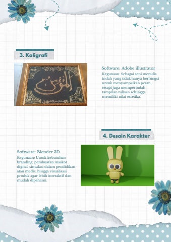 3. KaligrafiSoftware: Adobe illustratorKegunaan: Sebagai seni menulisindah yang tidak hanya berfungsiuntuk menyampaikan pesan,tetapi juga memperindahtampilan tulisan sehinggamemiliki nilai estetika.4. Desain KarakterSoftware: Blender 3DKegunaan: Untuk kebutuhanbranding, pembuatan maskotdigital, simulasi dalam pendidikanatau medis, hingga visualisasiproduk agar lebih interaktif danmudah dipahami.
