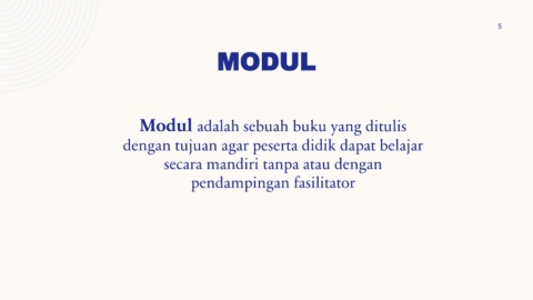 5 MODUL Modul adalah sebuah buku yang ditulis dengan tujuan agar peserta didik dapat belajar secara mandiri tanpa atau dengan pendampingan fasilitator