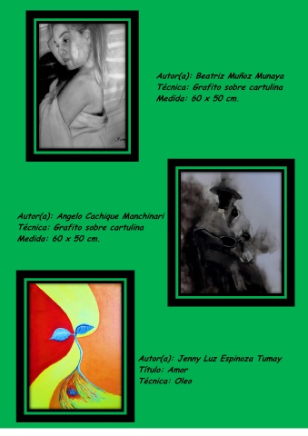 Autor(a): Beatriz Muñoz Munaya Técnica: Grafito sobre cartulina Medida: 60 x 50 cm. Autor(a): Angelo Cachique Manchinari Técnica: Grafito sobre cartulina Medida: 60 x 50 cm. Autor(a): Jenny Luz Espinoza Tumay Título: Amor Técnica: Oleo