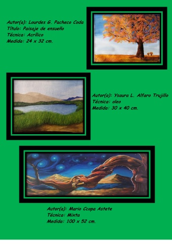 Autor(a): Lourdes G. Pacheco Coda Título: Paisaje de ensueño Técnica: Acrílico Medida: 24 x 32 cm. Autor(a): Ysaura L. Alfaro Trujillo Técnica: oleo Medida: 30 x 40 cm. Autor(a): Mario Ccopa Astete Técnica: Mixta Medida: 100 x 52 cm.