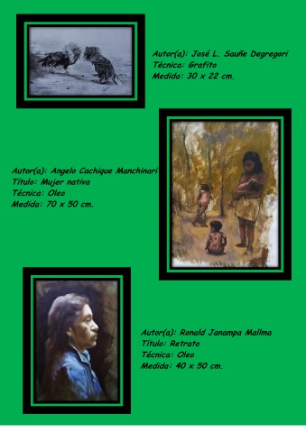 Autor(a): José L. Sauñe Degregori Técnica: Grafito Medida: 30 x 22 cm. Autor(a): Angelo Cachique Manchinari Título: Mujer nativa Técnica: Oleo Medida: 70 x 50 cm. Autor(a): Ronald Janampa Mallma Título: Retrato Técnica: Oleo Medida: 40 x 50 cm.