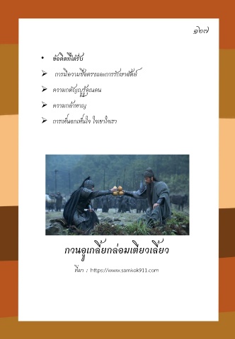 ๑๒๗ • ข้อคิดที่ได้รับ การมีความซื่อตรงและการรักษาสัตย์ ความกตัญญูรู้คุณคน ความกล้าหาญ การเห็นอกเห็นใจ ใจเขาใจเรา กวนอูเกลี้ยกล่อมเตียวเลี้ยว ที่มา : https://www.samkok911.com