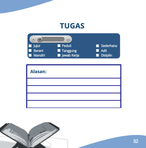 TUGAS Jujur Peduli Sederhana Berani Tanggung Adil Mandiri jawab Kerja Disiplin keras Alasan: 32