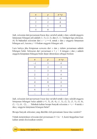 (5, −1), (6, −2), ... . Tahukah kalian berapa banyak selesaian x + y = 4 untuk x