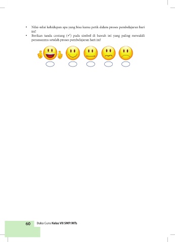 • Nilai-nilai kehidupan apa yang bisa kamu petik dalam proses pembelajaran hari ini! • Berikan tanda centang () pada simbol di bawah ini yang paling mewakili perasaanmu setalah proses pembelajaran hari ini! 60 Buku Guru Kelas VII SMP/MTs