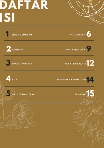 DAFTAR ISI 1 TENTANG LUKISAN PAK UDIYANA 6 2 PAMERAN PAK NASRUDDIN 9 3 FUNGSI PAMERAN PAK G. HARIYANTO 12 4 PSLI SARAN DAN KESIMPULAN 14 5 HASIL WAWANCARA PENUTUP 15