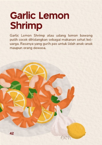 Garlic Lemon Shrimp Garlic Lemon Shrimp atau udang lemon bawang putih cocok dihidangkan sebagai makanan sehat kel- uarga. Rasanya yang gurih pas untuk lidah anak-anak maupun orang dewasa. 42