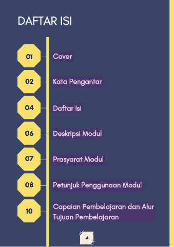 DAFTAR ISI 01 Cover 02 Kata Pengantar 04 Daftar Isi 06 Deskripsi Modul 07 Prasyarat Modul 08 Petunjuk Penggunaan Modul Capaian Pembelajaran dan Alur 10 Tujuan Pembelajaran 4