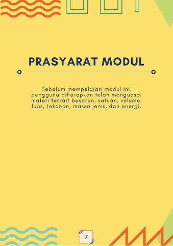 PRASYARAT MODUL Sebelum mempelajari modul ini, pengguna diharapkan telah menguasai materi terkait besaran, satuan, volume, luas, tekanan, massa jenis, dan energi. 7