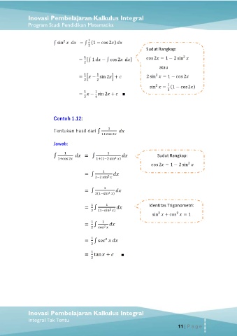 Inovasi Pembelajaran Kalkulus Integral Program Studi Pendidikan Matematika Sudut Rangkap: atau Contoh 1.12: Tentukan hasil dari Jawab: Sudut Rangkap: Identitas Trigonometri: Inovasi Pembelajaran Kalkulus Integral Integral Tak Tentu 11 | P a g e