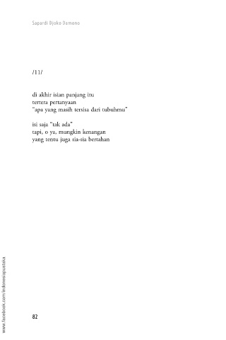 Sapardi Djoko Damono /11/ di akhir isian panjang itu tertera pertanyaan “apa yang masih tersisa dari tubuhmu” isi saja “tak ada” tapi, o ya, mungkin kenangan yang tentu juga sia-sia bertahan www.facebook.com/indonesiapustaka 82