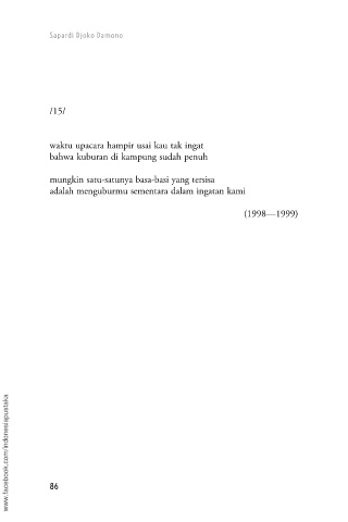 Sapardi Djoko Damono /15/ waktu upacara hampir usai kau tak ingat bahwa kuburan di kampung sudah penuh mungkin satu-satunya basa-basi yang tersisa adalah menguburmu sementara dalam ingatan kami (1998—1999) www.facebook.com/indonesiapustaka 86