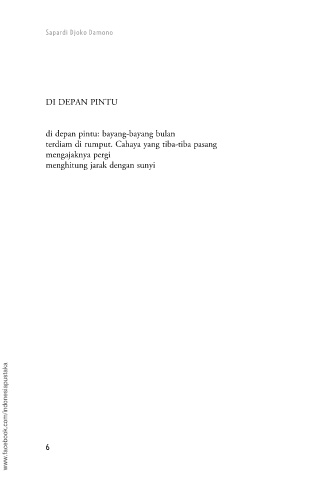 Sapardi Djoko Damono DI DEPAN PINTU di depan pintu: bayang-bayang bulan terdiam di rumput. Cahaya yang tiba-tiba pasang mengajaknya pergi menghitung jarak dengan sunyi www.facebook.com/indonesiapustaka 6