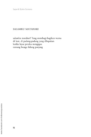 Sapardi Djoko Damono SALAMKU MATAHARI salamku matahari! Yang membagi-bagikan warna di laut, di padang-padang yang dilupakan ketika layar perahu mengigau tentang bunga ilalang panjang www.facebook.com/indonesiapustaka 16