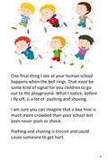 One final thing I see at your human school happens when the bell rings. That must be some kind of signal for you children to go out to the playground. What I notice, before I fly off, is a lot of pushing and shoving.