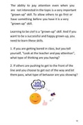 The ability to pay attention even when you are not interested in the topic is a very important “grown-up” skill. To allow others to go first or have something before you have it is a very “grown-up” skill.