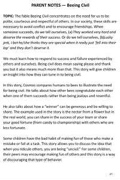 TOPIC: The fable Beeing Civil concentrates on the need for us to be polite, courteous and respectful of others. In our society, these skills are necessary to avoid conflict and to encourage friendships. When someone succeeds, do we tell ourselves, (a) They worked very hard and deserve the rewards of their success. Or do we tell ourselves, (b)Lucky jerk, I bet he/she thinks they are special when it really just ‘fell into their lap’ and they don’t deserve it.