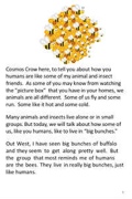 Cosmos Crow here, to tell you about how you humans are like some of my animal and insect friends. As some of you may know from watching the “picture box” that you have in your homes, we animals are all different. Some of us fly and some run. Some like it hot and some cold.