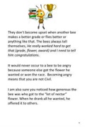 They don’t become upset when another bee makes a better grade or flies better or anything like that. The bees always tell themselves, He really worked hard to get that (grade, flower, award) and I need to tell him congratulations.