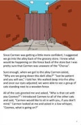 All of the cats greeted me and asked, “Who is that cat with you Cosmos?” I introduced Carmen to all of the other cats and said, “Carmen would like to sit in with you, if you don’t mind.” Carmen looked at me and asked in a low whisper, “Cosmos, what is going on?”
