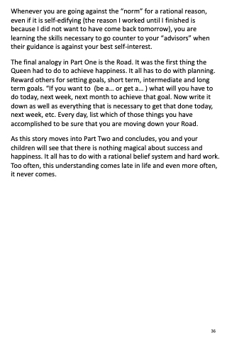 The final analogy in Part One is the Road. It was the first thing the Queen had to do to achieve happiness. It all has to do with planning. Reward others for setting goals, short term, intermediate and long term goals. “If you want to (be a... or get a... ) what will you have to do today, next week, next month to achieve that goal. Now write it down as well as everything that is necessary to get that done today, next week, etc. Every day, list which of those things you have accomplished to be sure that you are moving down your Road.