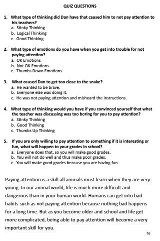 Paying attention is a skill all animals must learn when they are very young. In our animal world, life is much more difficult and dangerous than in your human world. Humans can get into bad habits such as not paying attention because nothing bad happens for a long time. But as you become older and school and life get more complicated, being able to pay attention will become a very important skill for you.
