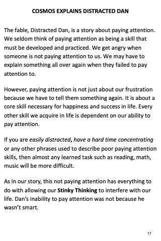 The fable, Distracted Dan, is a story about paying attention. We seldom think of paying attention as being a skill that must be developed and practiced. We get angry when someone is not paying attention to us. We may have to explain something all over again when they failed to pay attention to.