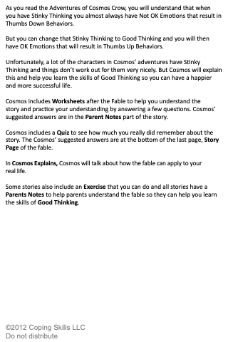 Some stories also include an Exercise that you can do and all stories have a Parents Notes to help parents understand the fable so they can help you learn the skills of Good Thinking.