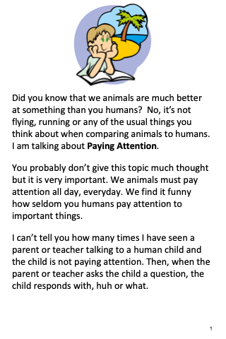 Did you know that we animals are much better at something than you humans? No, it’s not flying, running or any of the usual things you think about when comparing animals to humans. I am talking about Paying Attention.