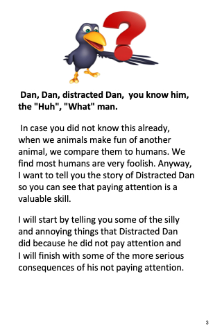 when we animals make fun of another animal, we compare them to humans. We find most humans are very foolish. Anyway, I want to tell you the story of Distracted Dan so you can see that paying attention is a valuable skill.
