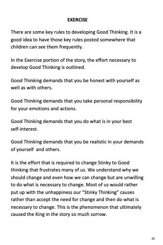 It is the effort that is required to change Stinky to Good thinking that frustrates many of us. We understand why we should change and even how we can change but are unwilling to do what is necessary to change. Most of us would rather put up with the unhappiness our “Stinky Thinking” causes rather than accept the need for change and then do what is necessary to change. This is the phenomenon that ultimately caused the King in the story so much sorrow.
