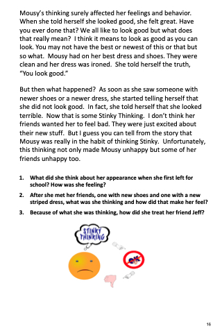 But then what happened? As soon as she saw someone with newer shoes or a newer dress, she started telling herself that she did not look good. In fact, she told herself that she looked terrible. Now that is some Stinky Thinking. I don’t think her friends wanted her to feel bad. They were just excited about their new stuff. But I guess you can tell from the story that Mousy was really in the habit of thinking Stinky. Unfortunately, this thinking not only made Mousy unhappy but some of her friends unhappy too.
