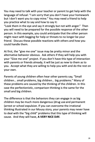 The difference is that the behaviors they can engage in as big children may be much more dangerous (drug use and permanent (arrest or school expulsion. If you can overcome the irrational thinking illustrated in our Mousy story, your parents may never have to deal with the “big child” problems that this type of thinking will cause. And they will have, A VERY NICE DAY.