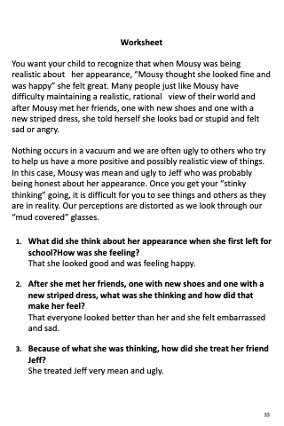You want your child to recognize that when Mousy was being realistic about her appearance, “Mousy thought she looked fine and was happy” she felt great. Many people just like Mousy have difficulty maintaining a realistic, rational view of their world and after Mousy met her friends, one with new shoes and one with a new striped dress, she told herself she looks bad or stupid and felt sad or angry.