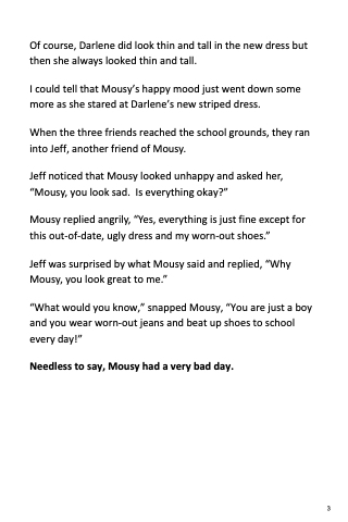 “What would you know,” snapped Mousy, “You are just a boy and you wear worn-out jeans and beat up shoes to school every day!”