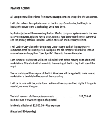 My first objective will be converting the four MacPro computer systems over to the new MacPro computers. I plan to have a clean, external hard drive with the most current OS and the primary software installed. (Adobe, Microsoft and necessary utilities.)