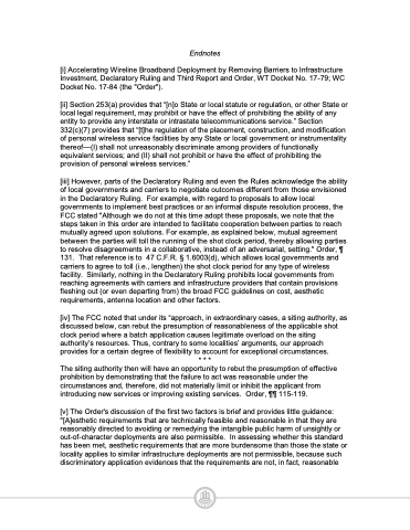 [v] The Order's discussion of the first two factors is brief and provides little guidance: "[A]esthetic requirements that are technically feasible and reasonable in that they are reasonably directed to avoiding or remedying the intangible public harm of unsightly or out-of-character deployments are also permissible. In assessing whether this standard has been met, aesthetic requirements that are more burdensome than those the state or locality applies to similar infrastructure deployments are not permissible, because such discriminatory application evidences that the requirements are not, in fact, reasonable