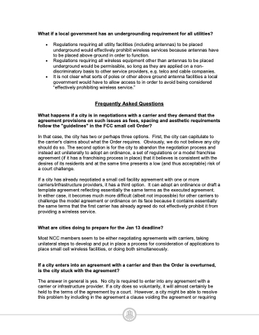 In that case, the city has two or perhaps three options. First, the city can capitulate to the carrier's claims about what the Order requires. Obviously, we do not believe any city should do so. The second option is for the city to abandon the negotiation process and instead act unilaterally to adopt an ordinance, a set of regulations or a model franchise agreement (if it has a franchising process in place) that it believes is consistent with the desires of its residents and at the same time presents a low (and thus acceptable) risk of a court challenge.
