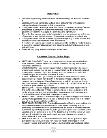 • SHOT CLOCK DEADLINES - The deadlines may be difficult to meet, but there is NO DEEMED GRANTED provision in this order. Batch permitting may be particularly problematic for local governments as the scope of such requests can overwhelm a permitting department, but if you work in good faith, keep the carrier updated, and are still unable to meet the deadline, it is likely the carrier will work with you. If instead they take you to court, your due diligence and proactive efforts will work in your favor.