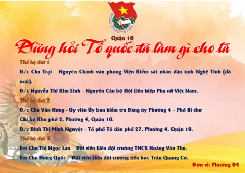 Đ/c Đinh Thị Minh Nguyệt – Tổ phố Tổ dân phố 27, Phường 4, Quận 10.